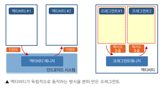 (Activity = 전체적인 UI에 포함될 요소 배치, Fragment = 단일 화면, 화면 일부에 관한 UI 정의. 아래 이미지 참고)