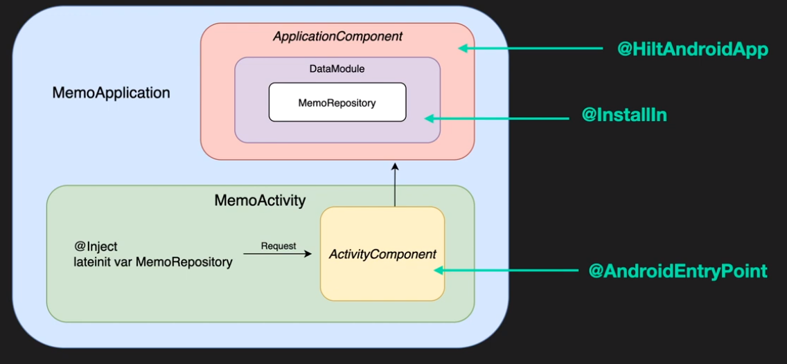 - @HiltAndroidApp을 통해 ApplicationComponent가 생성된다.