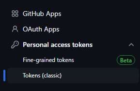 이후 좌측 메뉴의 personal access tokens(classic)