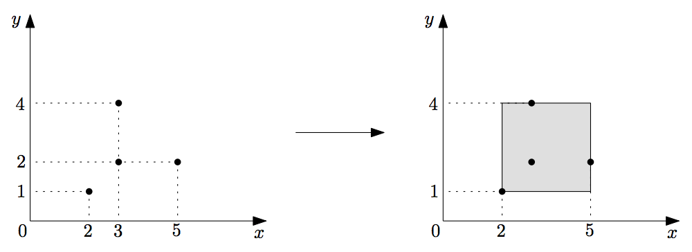 예를 들어 위와 같이 (2, 1), (3, 2), (5, 2), (3, 4) 네 점에서 옥구슬을 발견하였다면, 임씨에게 돌아갈 대지는 (2, 1), (5, 1), (2, 4), (5, 4)를 네 꼭짓점으로 하는 직사각형이며, 넓이는 (5 - 2) × (4 - 1) = 9 가 된다.