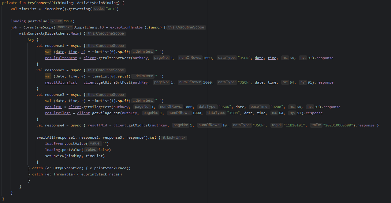 이 때 코루틴스코프와 withContext 내부에서 통신하는 방식이 잘못되었다는 생각이 들어 api 통신이 전부 끝나고 넘어가는 방법을 강구하게 됨. (기존에는 각 api마다 callback이 나눠져 있었음)