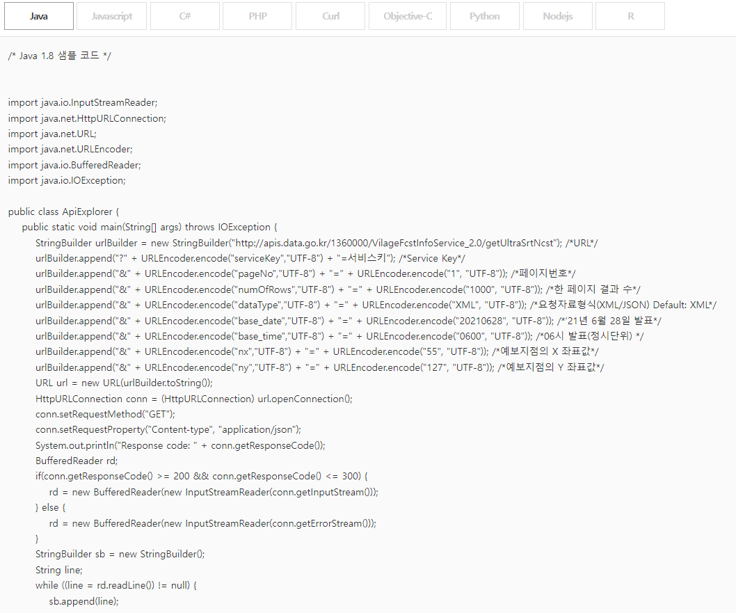 Java를 쓸 때 API는 data.go.kr의 만드는 주제와 맞는 API에 쓰여있는 코드를 가져와서 그대로 버그만 수정해서 썼었기에 코드가 이쁘건 안이쁘건 데이터가 파싱해오기만 했으면 됐었다.
