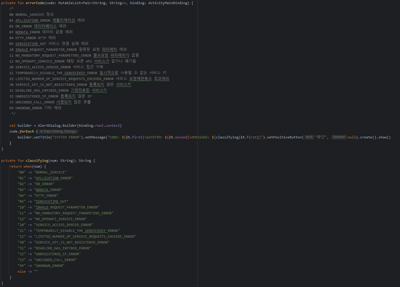 때문에 resultCode가 "00"(정상)이 아니라면 List<Pair<String, String>>에 에러코드와 에러가 난 API를 담게 해두었다.