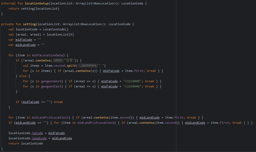 중기육지기상은 작은단위(도시)부터 돌고, 돌았는데도 midLandCode가 ""라면 큰단위(광역시, ㅇㅇ도) array를 돌게 만들어 어떻게든 code를 챙기게 만들었다.