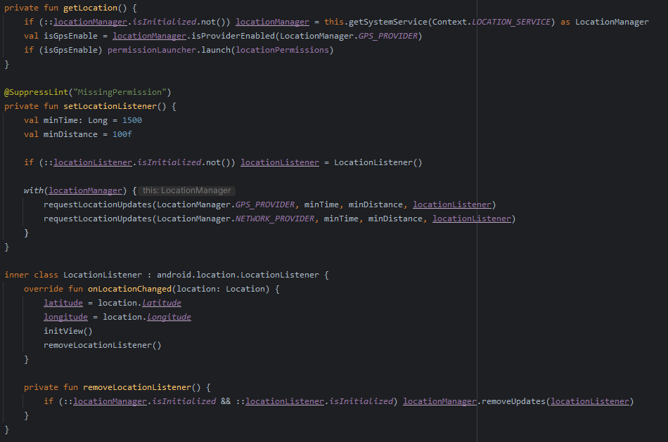 - mainActivity에 gps를 추가하여 받아온 위경도를 통해 nx, ny와 추후 weekActivity에 사용되는 지역코드를 변환시켰다.