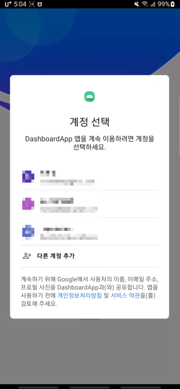 위 코드를 토대로 구글 로그인 버튼을 클릭하게 되면, gso, googleSignInClient를 통해 구글이 제공하는 계정 선택 UI가 뜨게 되고 선택하게 되면 activityResultLauncher로 resultCode OK를 통해 들어오게 된다.