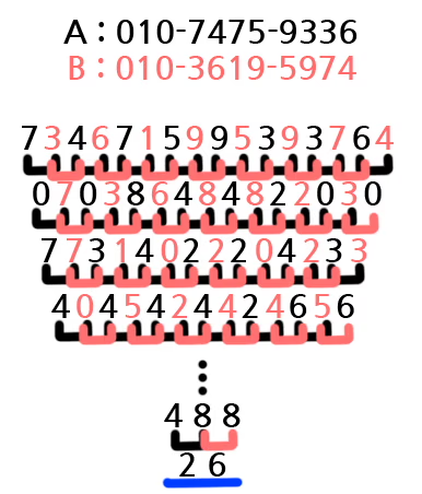 예를 들어, 아래의 그림과 같이 A의 번호가 010-7475-9336 이고, B의 번호가 010-3619-5974 이면, 7346715995393764에서 시작하여 070386484822030, 77314022204233, 4045424424656, 449966866011, 83852442612, 1137686873, 240344450, 64378895, 0705674, 775131, 42644, 6808, 488, 26이 되어 둘은 26%의 궁합률을 가지게 된다.
