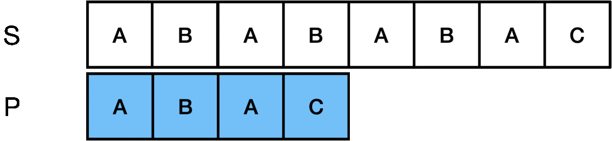위에서처럼 "ABABABCD"라는 문자열이 존재하고, "ABABC"라는 패턴이 존재할 때,