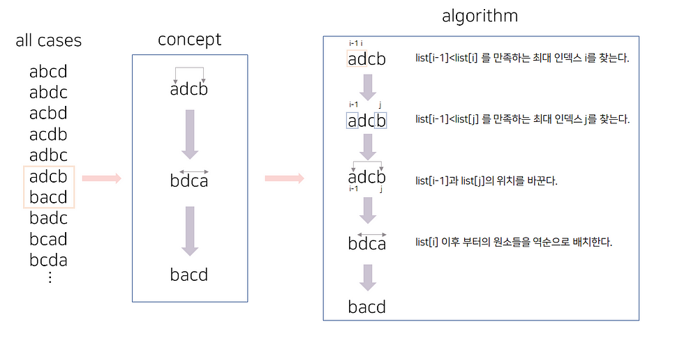 - 오른쪽부터 왼쪽으로 바꿀 위치 i를 찾는다.