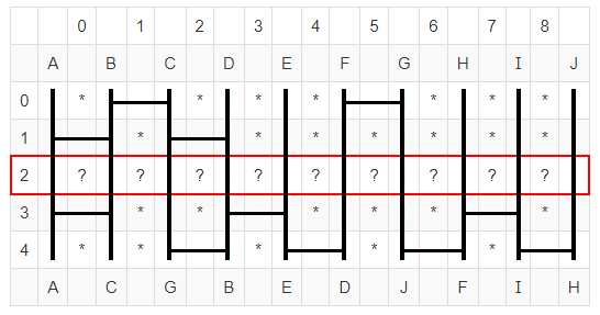 이 사다리에서 점선은 가로 막대가 없음을, 굵은 가로 실선은 옆으로 건너갈 수 있는 가로 막대가 있음을 나타내고 있다.