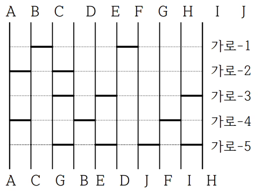 k=10 인 예를 들어 보자. 10명의 A, B, C, D, E, F, G, H, I, J 참가자들이 사다리 타기를 준비한다. 아래 그림은 10개의 세로 줄과 5개의 가로 줄을 가지고 있는 사다리의 한 예를 보여주고 있다.