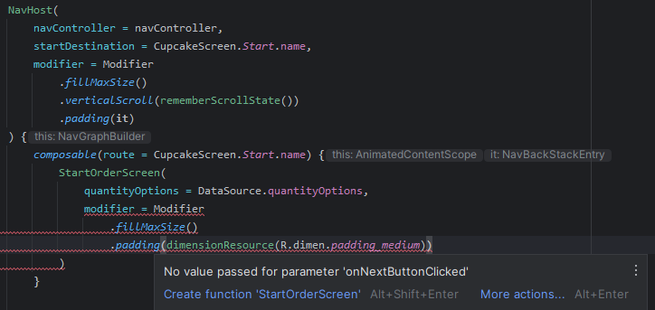 - startDestination: 앱에서 NavHost를 처음 표시할 때 기본적으로 표시되는 대상을 정의하는 문자열 경로이다. Cupcake 앱의 경우 Start 경로이다.