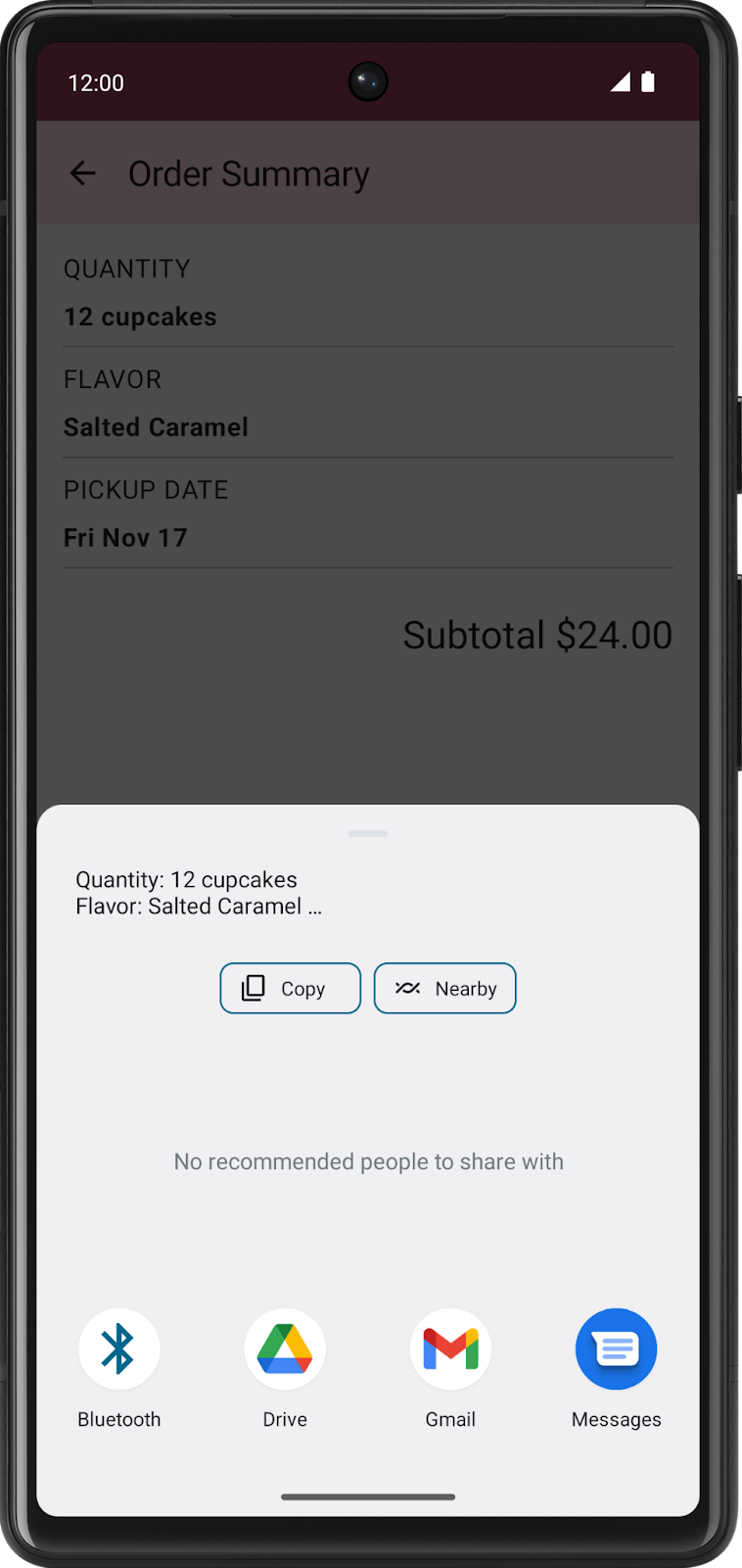 이제 앱을 실행해 마지막에 가서 버튼을 누르게 되면 다음과 같이 하단에 시스템 UI로 주문 정보가 요약되어 다른 애플리케이션에 공유할 수 있게 된다.