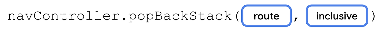 - inclusive: 불리언 값으로, true이면 지정된 경로 삭제, false이면 popBackStack()은 시작 대상 위의 모든 대상을(시작 화면은 삭제하지 않음) 삭제하여 시작 대상을 사용자에게 표시하는 최상단 화면으로 둔다.