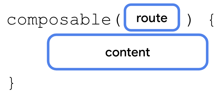 NavHost의 콘텐츠 함수 내부에서 composable() 함수를 호출한다. composable() 함수에는 필수 매개변수가 두 개 있다.