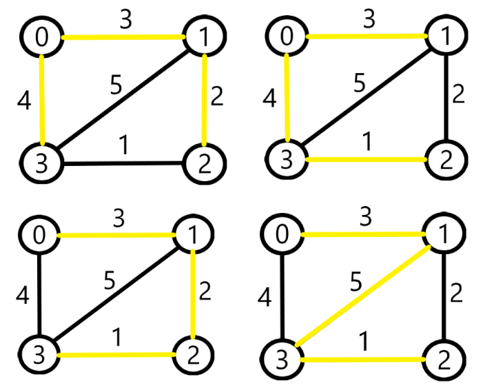모두 그래프의 모든 정점을 지난다는 것을 알 수 있으며, 순환고리(사이클이 생기지 않는 연결)이다.