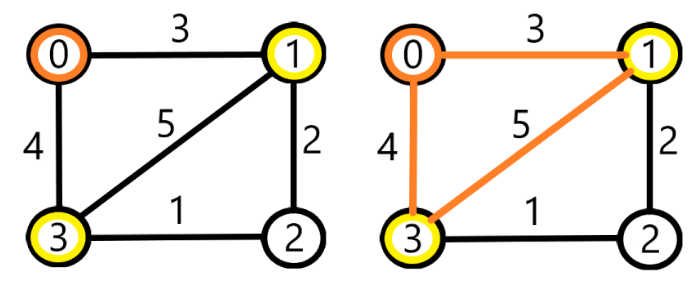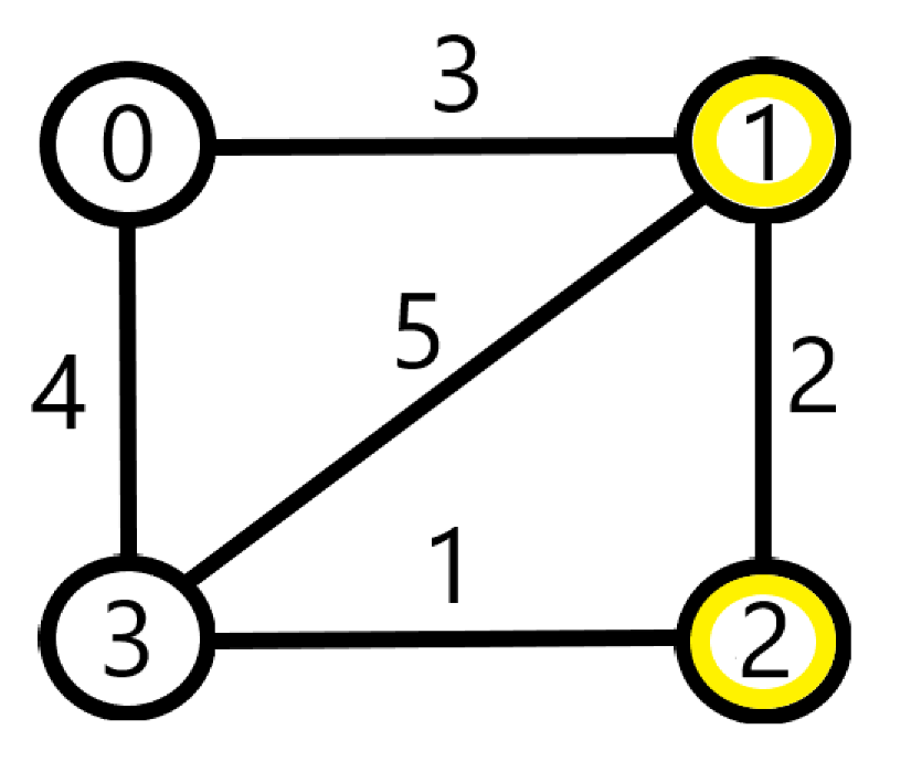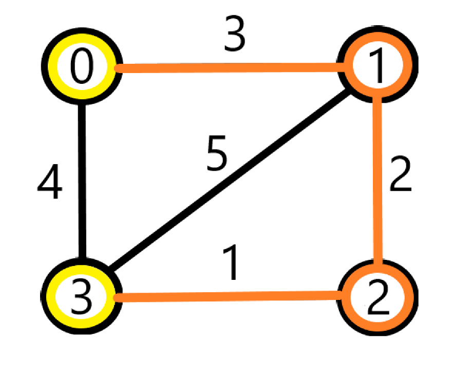 가중치 합 = 1 + 2 + 3 = 가장 짧은 경로 = 최소 신장 트리