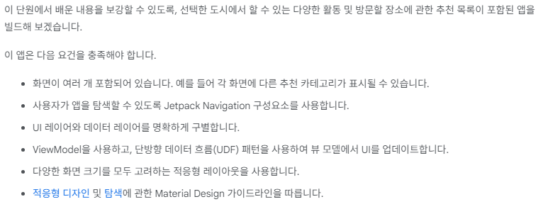 이전에 포스팅하던 JetpackCompose로 LazyList, State, 각종 Composable 함수, ViewModel, NavHostController, 적응형 앱, 반응형 UI 탐색까지 이르기의 모든 과정을 합친 앱을 만들라는 과정이 존재했다.