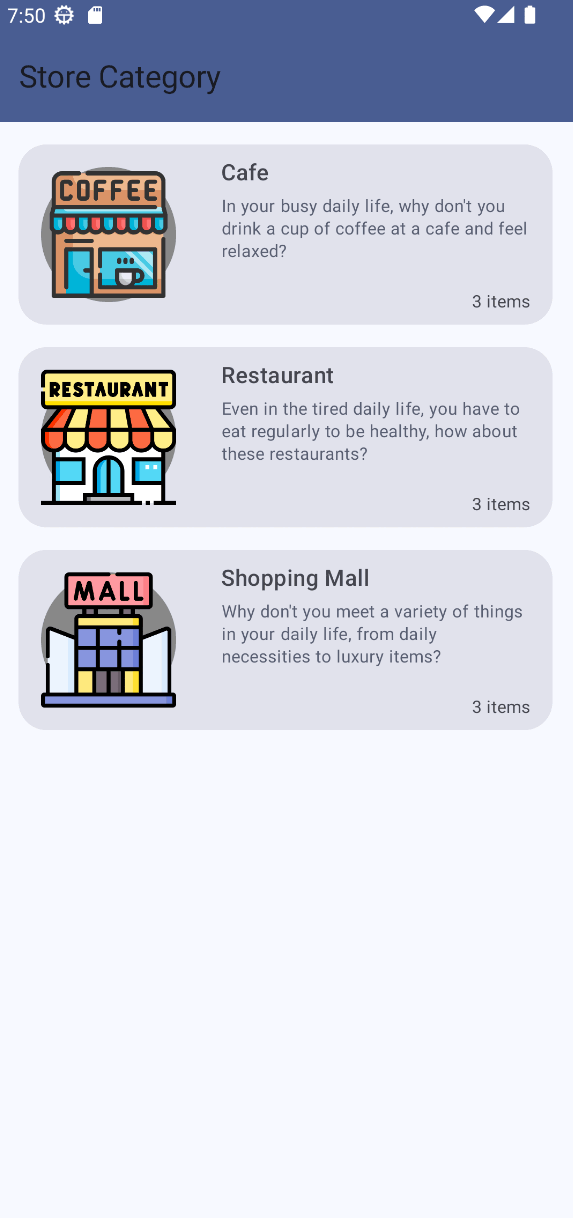 카테고리는 카페, 레스토랑, 쇼핑몰 3가지로 잡고, 3가지의 세부 항목 또한 3가지로 제한했다.