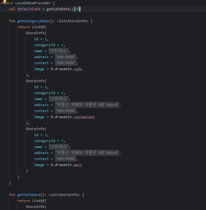strings Values 파일에 데이터를 추가하고, data.local.LocalDataProvider를 만든 뒤, 내부에 리턴 함수로 StoreInfo 데이터 클래스의 리스트를 리턴하게 만들었다.