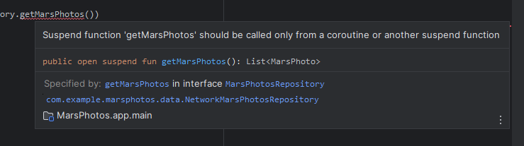 data/MarsPhotosRepository.kt에서 살펴보면 ViewModel에서 해당 함수 호출 시, viewmodelScope.launch()에 전달된 람다에서 호출하여 코루틴에서 이 메서드를 호출하기 때문에, 테스트 시에도 코루틴에서 정지 함수도 호출해야한다. 하지만 접근 방식은 다르다.